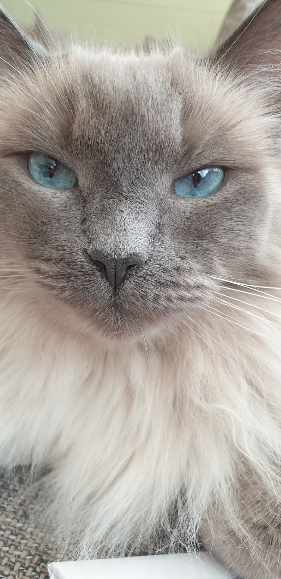 Han kan se nokså morsk ut, men her skal man ikke skue katten på pelsen, for dette er nok en av de største pysene jeg har møtt. Sånn til vanlig er han ganske så glad i å sove, men han sier ikke nei takk til litt kos heller. Med all den pelsen denne gutten har, klarer han ikke ligge lenge i fanget av gangen før han bråner bort og må skli ut på gulvet for nedkjøling.